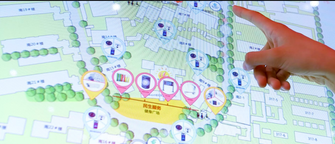 在清新優(yōu)雅的導(dǎo)覽圖上,整個(gè)社區(qū)面貌立體呈現(xiàn)——道路、廣場(chǎng)、居民樓、社區(qū)黨群服務(wù)中心等一個(gè)都不少,方寸間、長(zhǎng)廊、安防設(shè)備、科技產(chǎn)品等也都被一一標(biāo)注出來,營(yíng)造出社區(qū)的線上印象,也讓居民對(duì)智慧社區(qū)的民生項(xiàng)目一目了然。